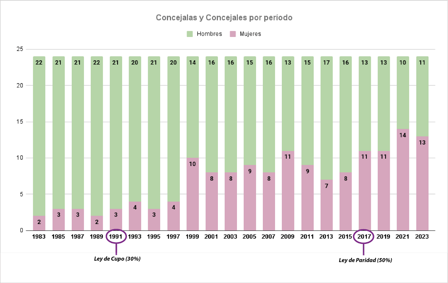 —La cosa es que hasta acá en 40 años de democracia pasaron 203 concejales y concejalas: 154 hombres y 58 mujeres (71,5% y 28,5%).